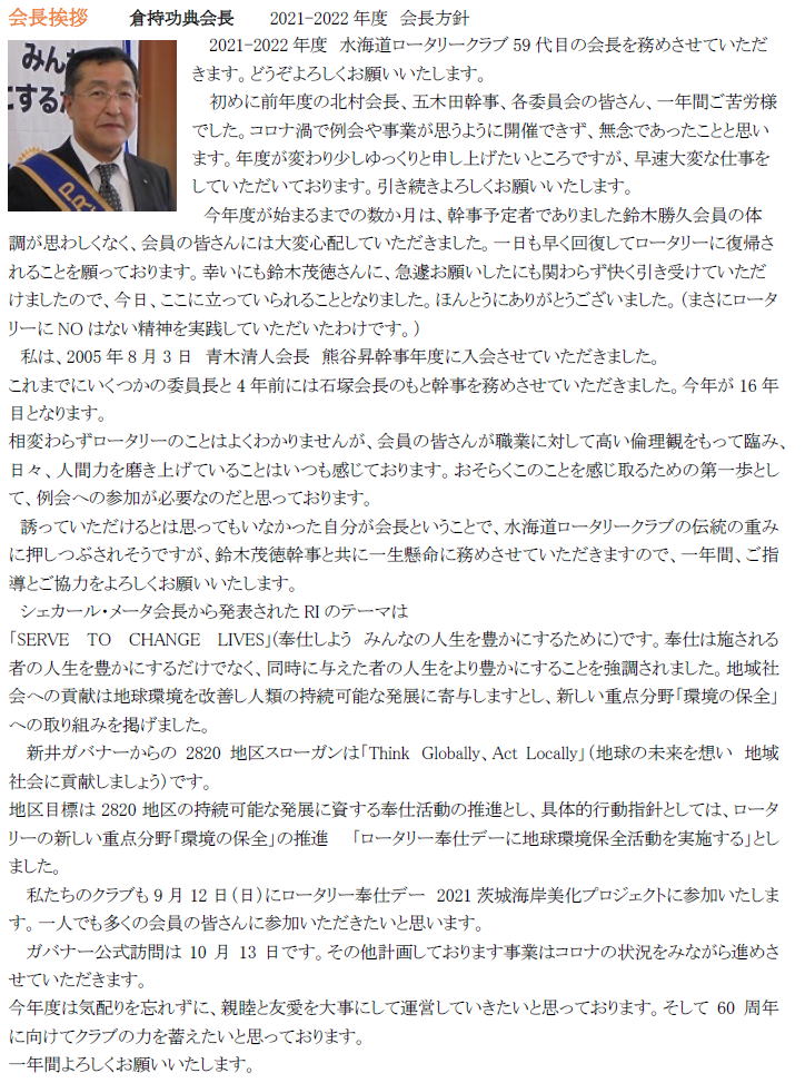 2021-2022年度 水海道RC 会長 倉持功典 幹事 鈴木茂徳
