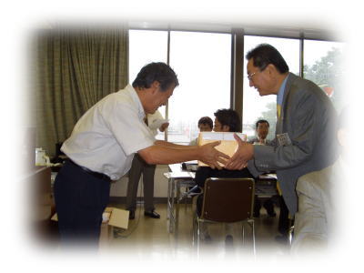 | 前年度白井出席委員長から贈り物を手渡される前会長 …何故か写真がこれ1枚しかありません |
