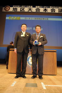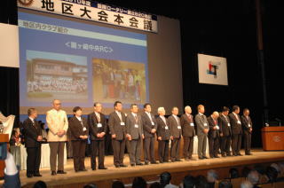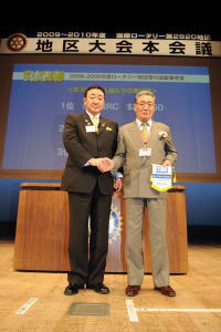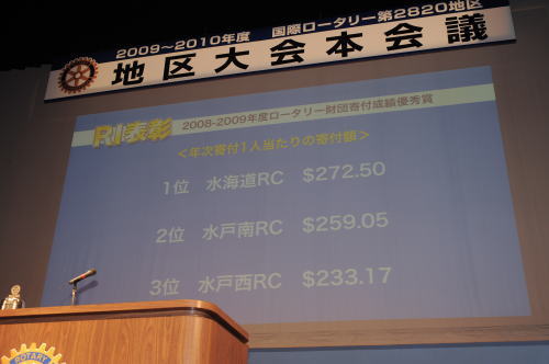 | 本会議第1日目で財団寄付一位のRI表彰を受けました。 | |